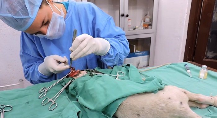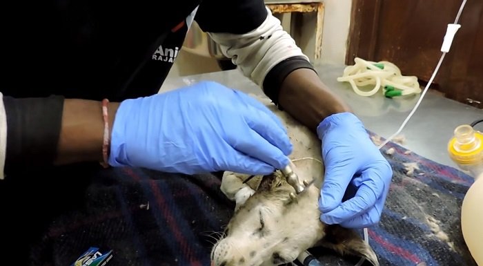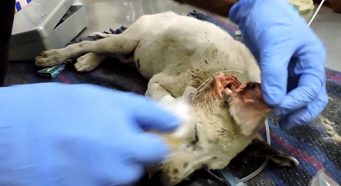 Дальше судьба собакена стала зависеть от рук опытных хирургов. Осмотр показал, что ухо надлежит ампутировать. Дабы не мучить малыша, его ввели в наркоз, обработали раны и отрезали мертвые ткани.