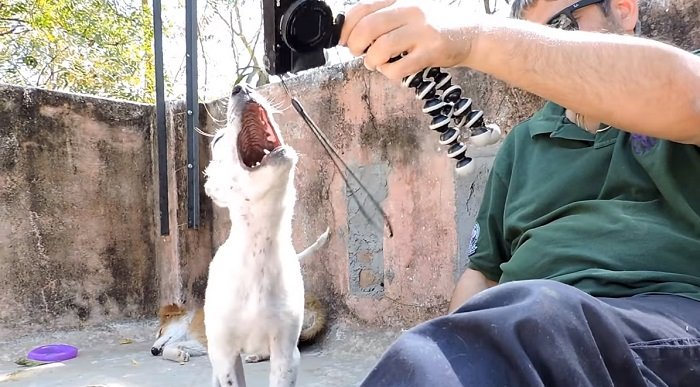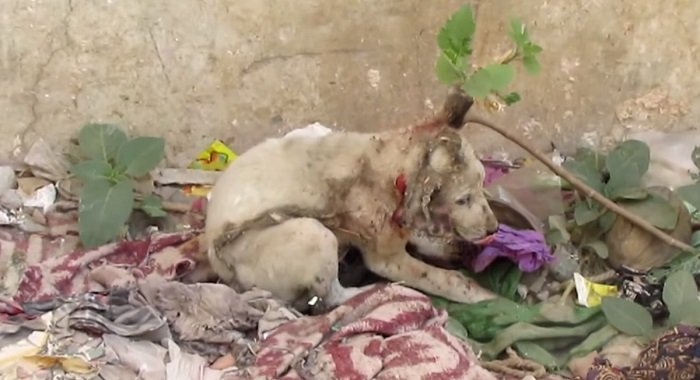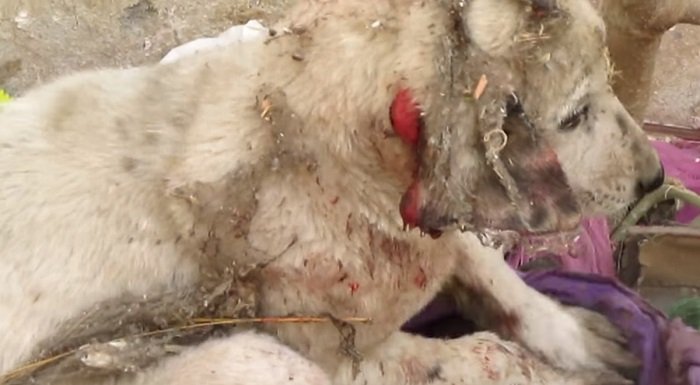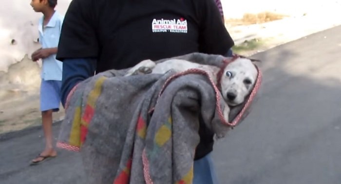 Следующим шагом для спасателя животных стала попытка взять щенка на руки. Для этого он использовал одеяло, но песик оказался настолько израненным, что даже прикосновения ткани причинило ему страдание и он взвыл от боли.
