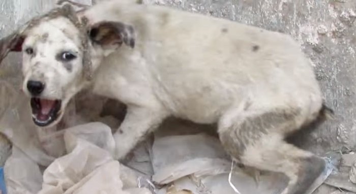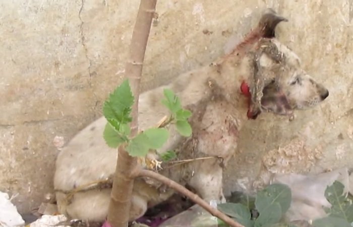Животное выглядит ужасающе: исхудавшее, грязное, забитое и перепуганное, с ужасной травмой правого уха.