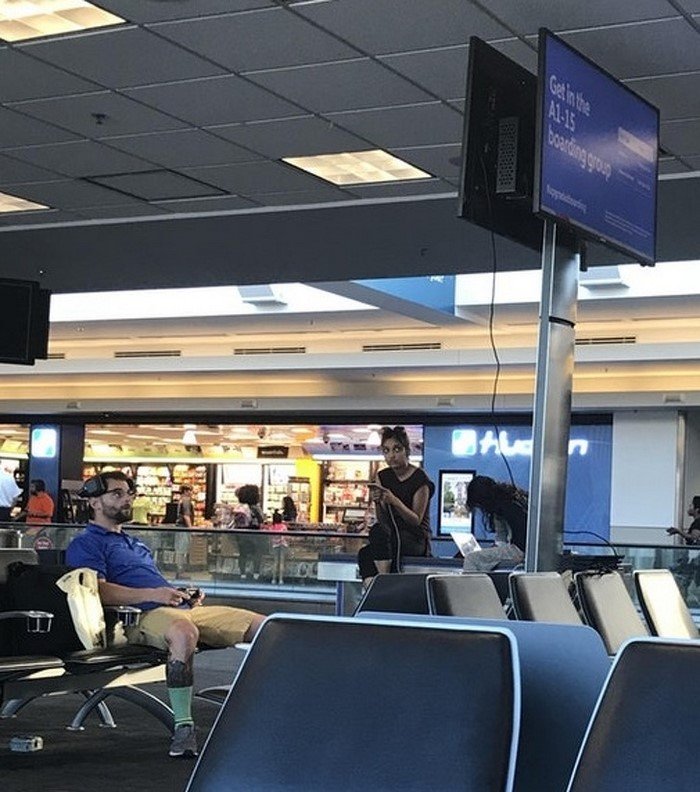 Ожидание рейса затянулось, но парень не растерялся и подключил PlayStation к монитору