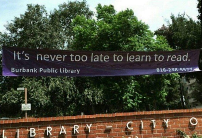 «Никогда не поздно научиться читать» — гласит реклама библиотеки