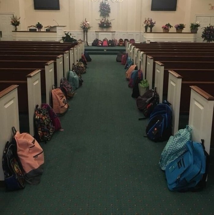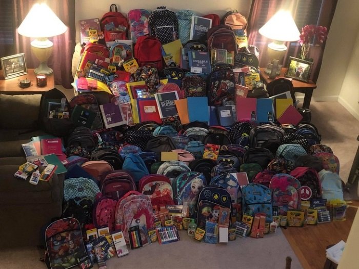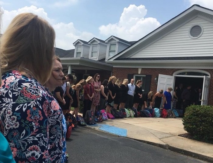 На прощание пришло около сотни коллег Тэмми, которые потом отнесли рюкзаки в свои школы и раздали детям из нуждающихся семей.