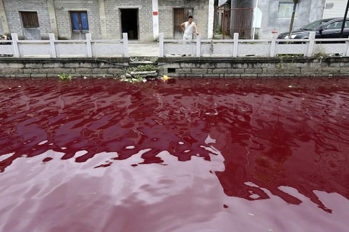 Река в китайской провинции Вэньчжоу стала красной после того, как на заводе по производству краски произошло ЧП