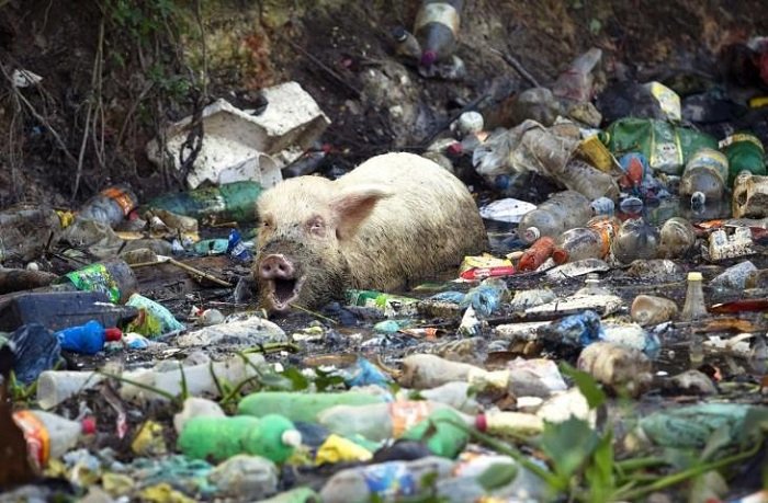 Свинья застряла в мусоре, пытаясь попить воды из ручья. Рио-де-Жанейро, Бразилия