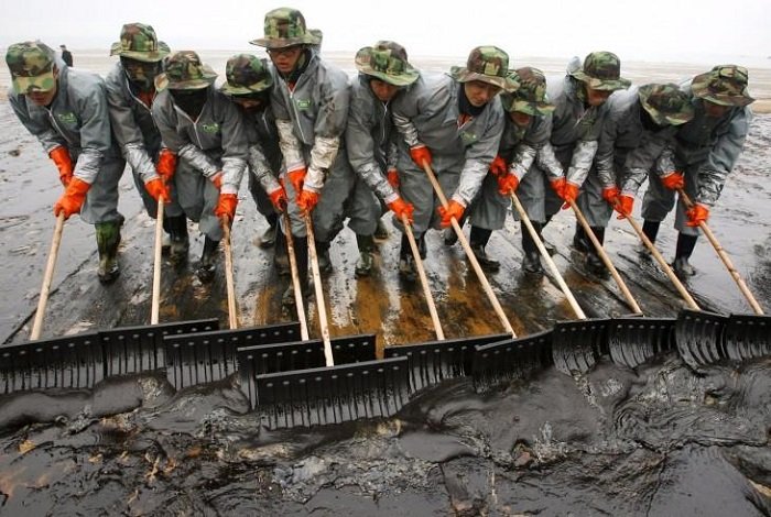 Южнокорейские солдаты ликвидируют последствия разлива нефти