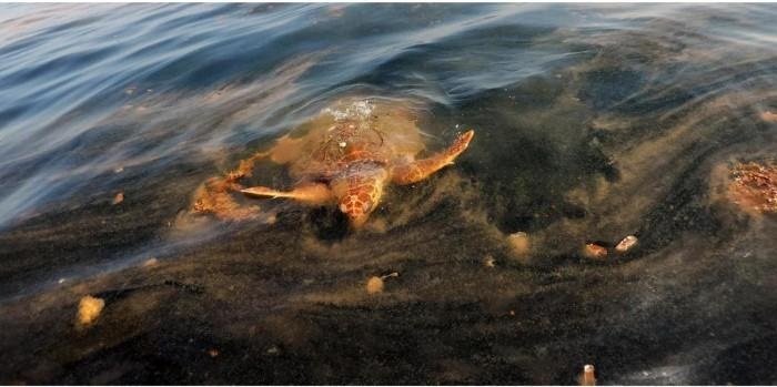 Морская черепаха вязнет в нефти, которой загрязнился Мексиканский залив из-за работы буровой установки
