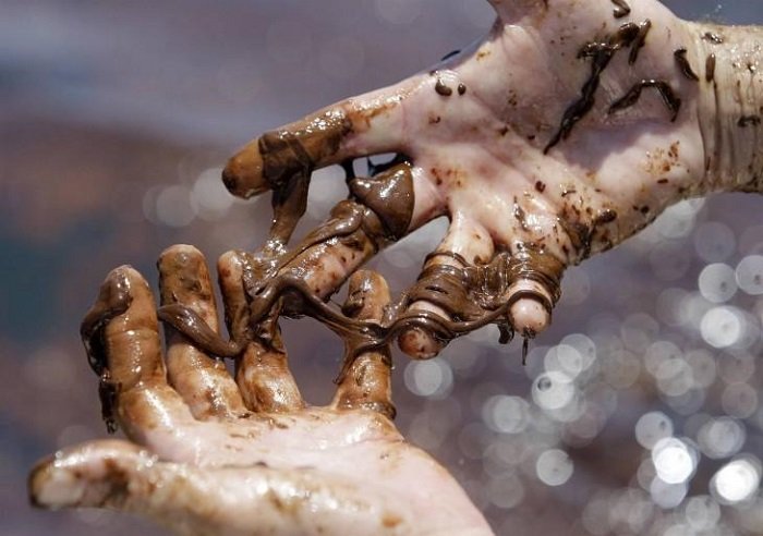 Эколог демонстрирует степень загрязненности Мексиканского залива нефтью. Тут расположено большое количество американский буровых вышек