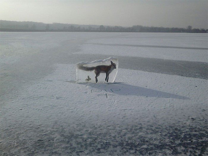 Человек, впрочем, умудряется приспособить для своих нужд даже созданные природой кошмары. Так, например, эту замерзшую насмерть лису кто-то вытащил из-под воды и установил на озере как предупреждение для любителей погулять по тонкому льду.
