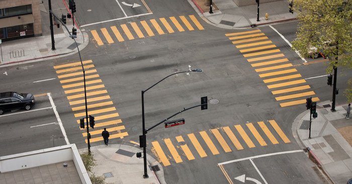 В первую очередь давай посмотрим на регулировщика. Его правая рука вытянута в левую сторону. Это означает, что пешеходы могут переходить улицу за спиной у регулировщика, трамваи могут совершить левый поворот, а остальные средства передвижения могут ехать в любом направлении.