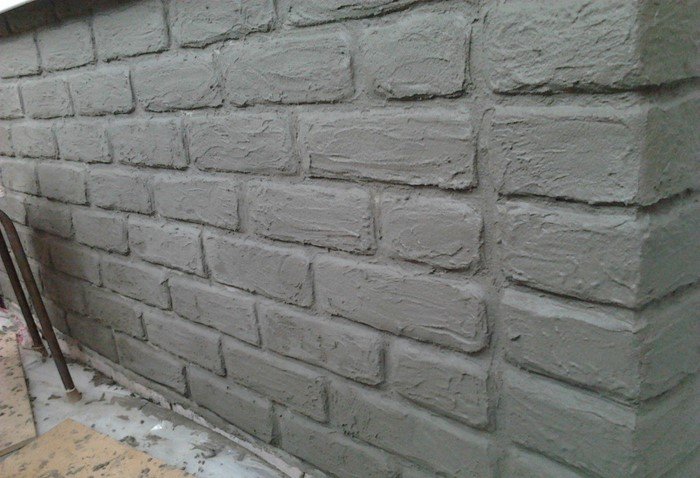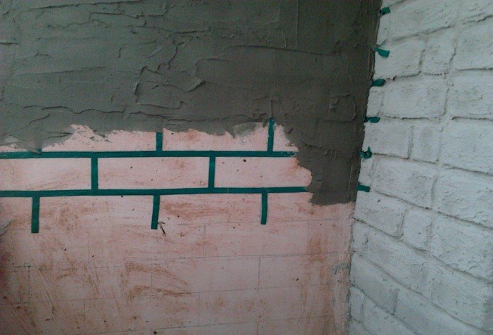 Всё это разбавляется водой до консистенции, напоминающей густую сметану. Ждем несколько минут, после чего снимаем изоленту, и ровная стена становится «кирпичной».