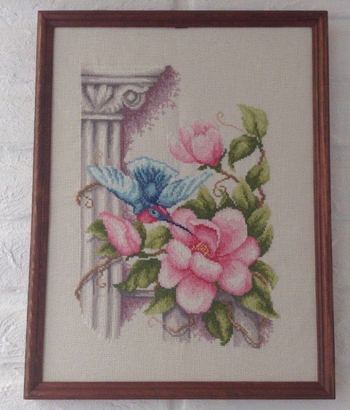 Для дополнительного уюта на стену повесили картину из вышивки, которую хозяйка сделала сама