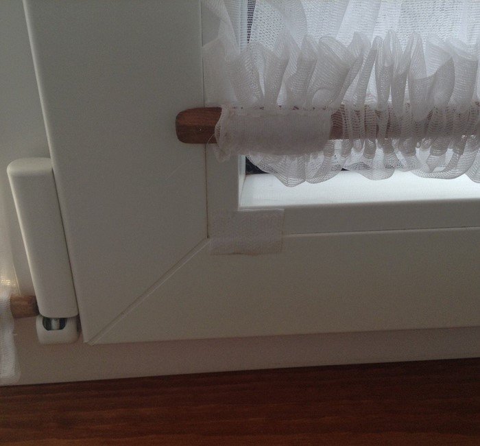Одну часть женщина приклеила к раме, а вторую пришила к самой шторе