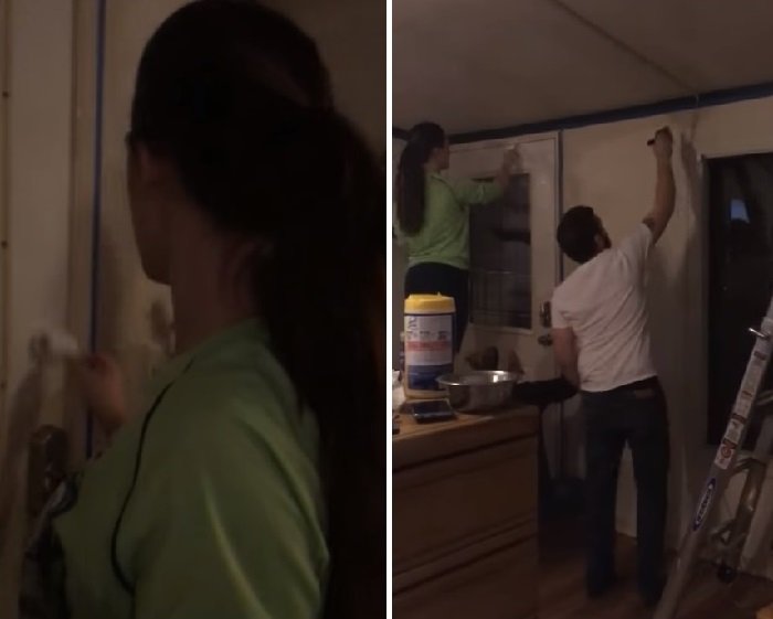 Сносить стены девушки не собирались, однако они ободрали старые обои и занялись покраской.