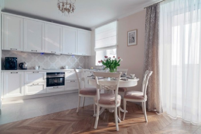 Отдельно стоит сказать о кухне. Чтобы выкроить больше места, ее объединили с гостиной. Просторные окна наполняют помещение дневным светом, который гармонично переливается с интерьером.