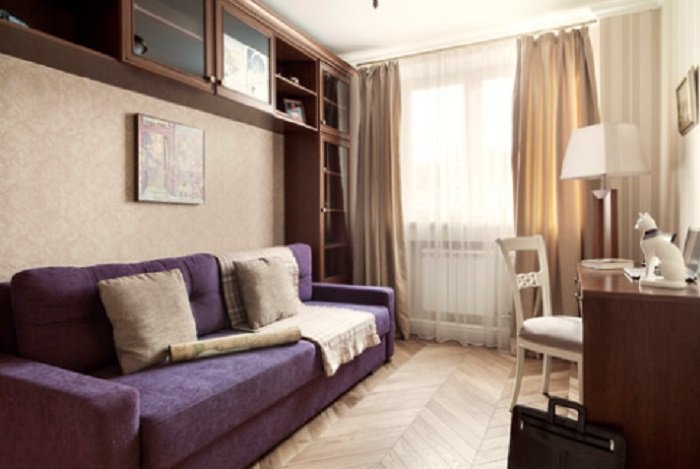 Ни один ведомственный дом не обходится без кабинета. Здесь хозяйка квартиры спокойно выполняет работу, а когда к ней приезжает родной сын, она с легкостью превращает помещение в гостевую комнату.