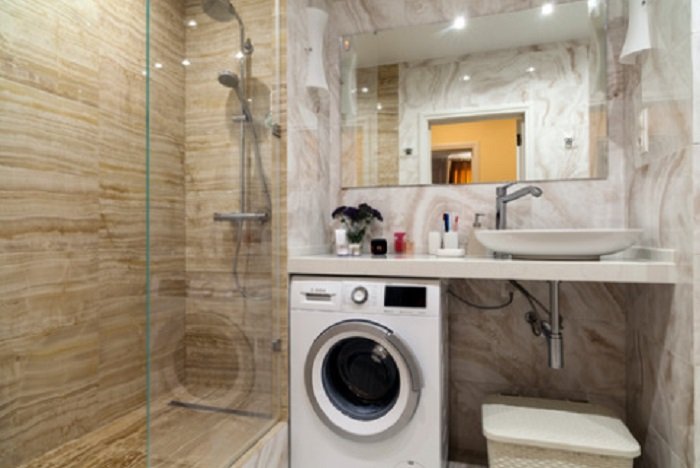 Работу над санузлом проделали с нуля. Вместо громоздкой и неуклюжей ванны установили душевую кабину, а под раковиной нашла свое место стиральная машина.