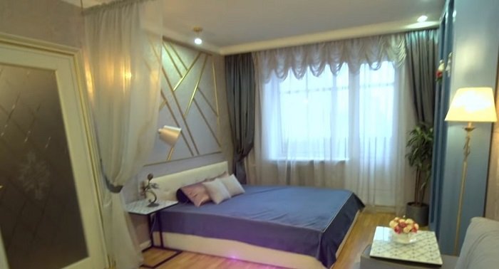 Елену с сыном отправили к ее сестре, чтобы рабочие смогли преобразовать это помещение в подобие чего-то жилого. Было решено постелить деревянный паркет, а саму комнату оформить в строгих серых тонах.