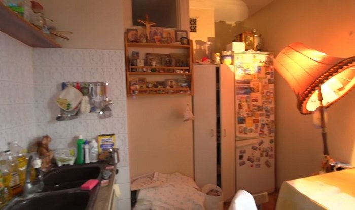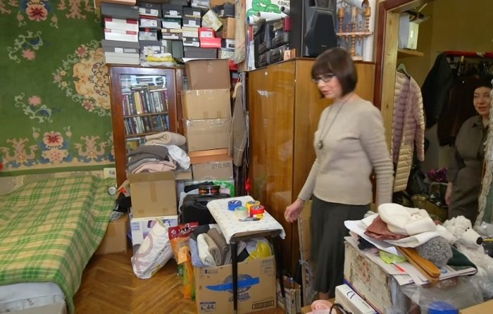 Актриса призналась, что ремонт не делали уже более 50 лет. Нагромождение коробок и прочего хлама на разваливающейся мебели она объяснила необходимостью, мол, это память о матери.
