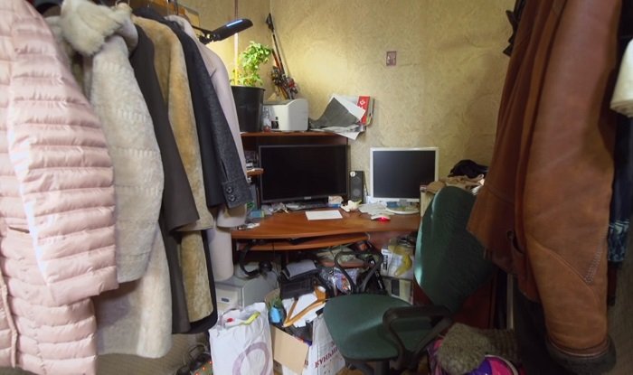 Как она уживается в однушке с взрослым сыном, остается загадкой. Женщина настолько безразлична к организации собственного пространства, что поставила рабочий стол с компьютером прямо в прихожей, в нише для верхней одежды.