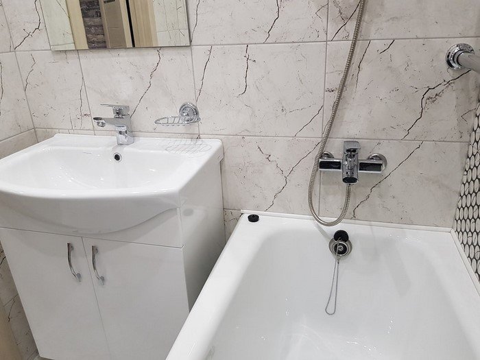 На плитку для ванной комнаты потратили 400 долларов. Владелец квартиры чистосердечно признался: очень хотел разобраться с вопросом самостоятельно, но в итоге засомневался в собственных силах и заплатил 200 долларов приятелю. Знакомец не подвел: плитка на стенах выглядит идеально!