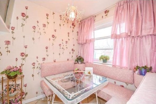 Кухня выполнена в нежно-розовых пастельных тонах, что настраивает на нужный лад.