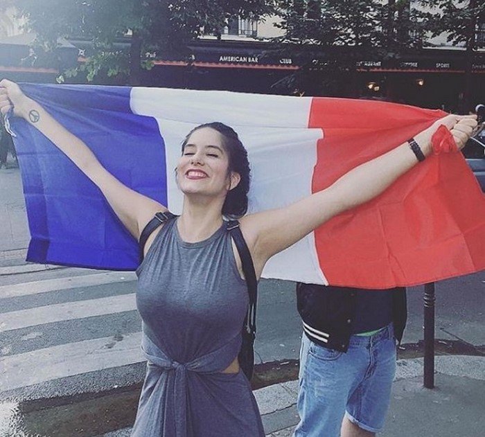 Жена бразильского защитника Маркиньоса, защищающего цвета парижского «Пари Сен-Жермен». Поддержать мужа она приехала вместе с дочерью.