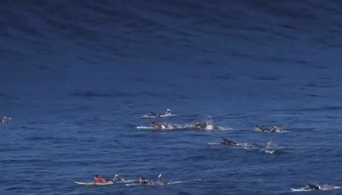 Сейчас перенесемся на жаркие Гавайи и увидим огромную волну 15-метровой высоты. Примечательно, что несметное количество серферов хотят прокатиться на ней.