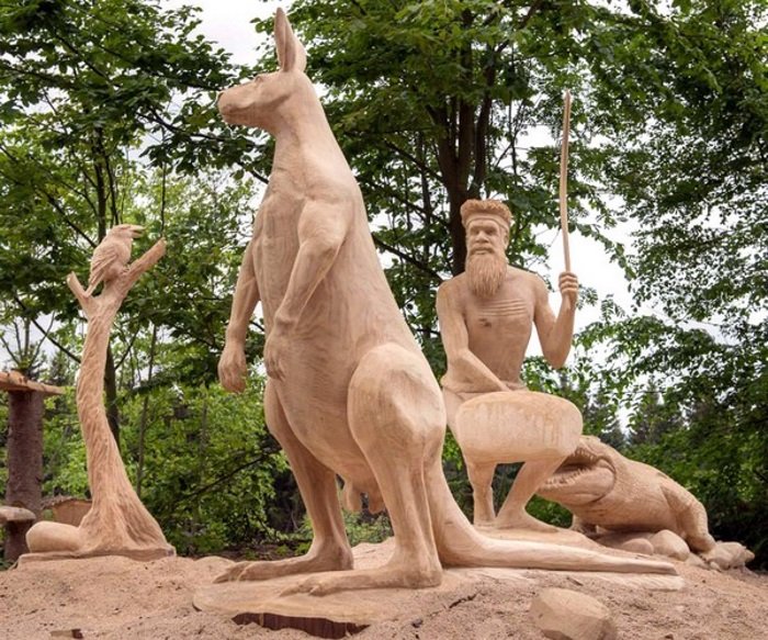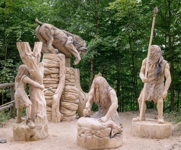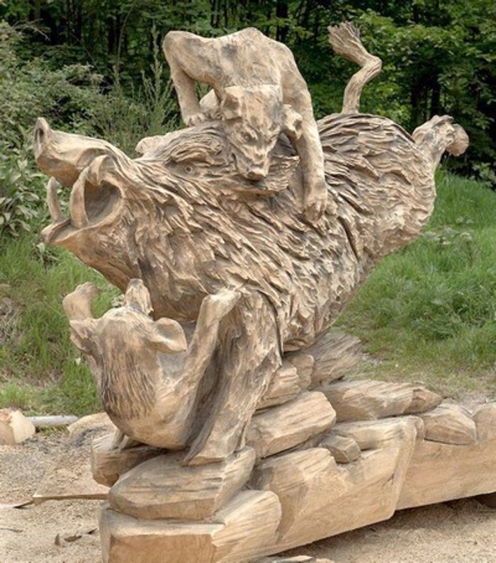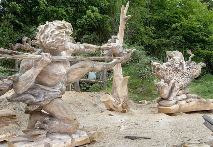 Мужчина должен был бросать копье, а рядом разъяренный вепрь, на которого набросились собаки, помогающие охотнику. Скульптуры делали из дуба. В итоге на работу в рамках конкурса ушло 5 дней! Судьи отдали первое место именно этой композиции.