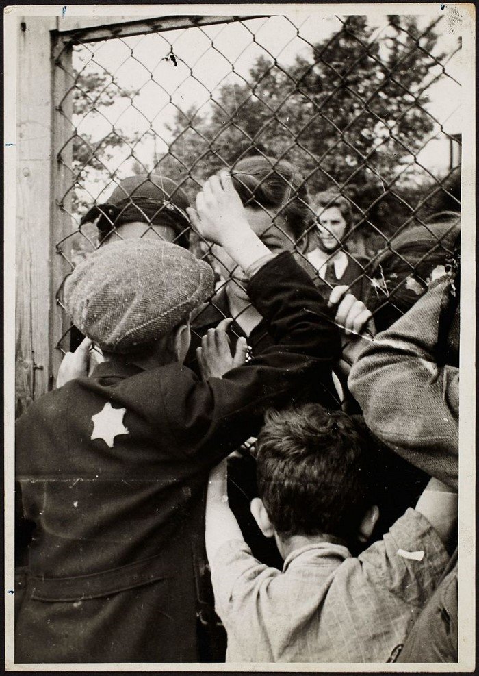 1942 год. Полицейские отгоняют пожилую женщину от колючей проволоки.