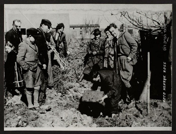 В 1944 году, незадолго до ликвидации гетто, фотограф закопал свои пленки и негативы, желая, чтобы они уцелели. В 1945 году чудом выживший Росс вернулся. На снимке ниже он как раз извлекает из земли коробку с бесценными кадрами.