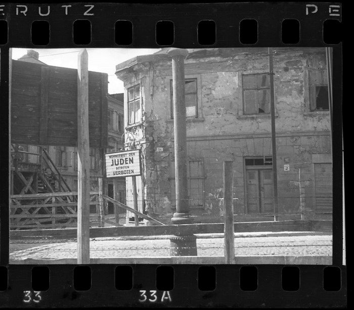 1940–1944 гг. Знак на входе в гетто гласит: «Евреи. Вход запрещен».