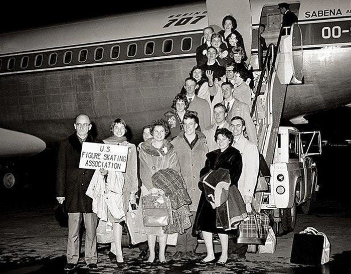 На черно-белом снимке улыбчивая молодежь машет фотографу руками. Ребята из американской сборной по фигурному катанию летели на пассажирском Boeing 707 из Нью-Йорка в Брюссель на чемпионат мира.