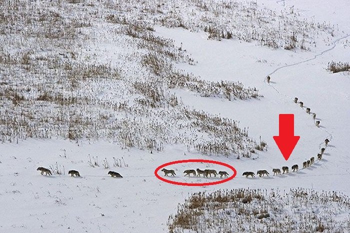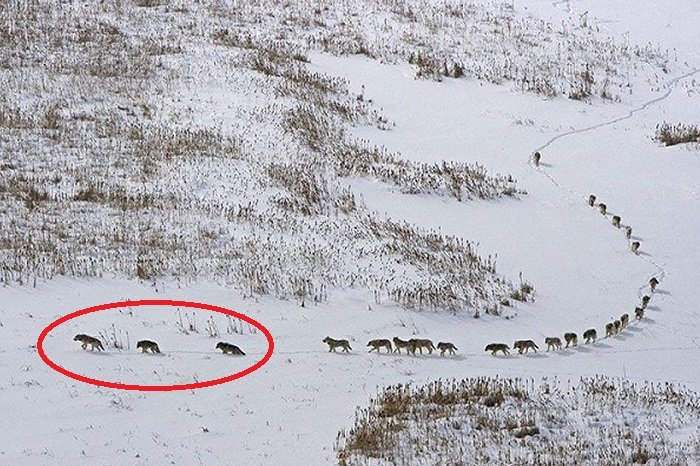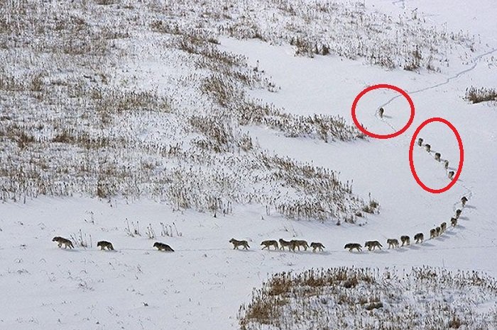 Вскоре какой-то умник выложил это фото, придумав совершенно другую дописку: «Впереди стаи идет трое слабых, умирающих волка. Они протаптывают дорогу, чтобы остальные не устали. Если волки попадут в засаду, то больные умрут первыми, перестав быть обузой для стаи.