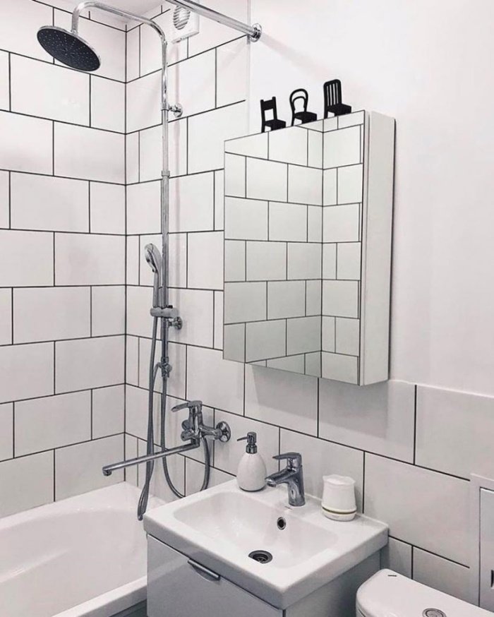 Простецкое овальное зеркало отправили на свалку, а вместо него повесили шкафчик с зеркальной дверцей. Полностью заменили всю сантехнику. Теперь в комнате есть отдельная раковина, новые ванна и унитаз, а все трубы спрятаны.
