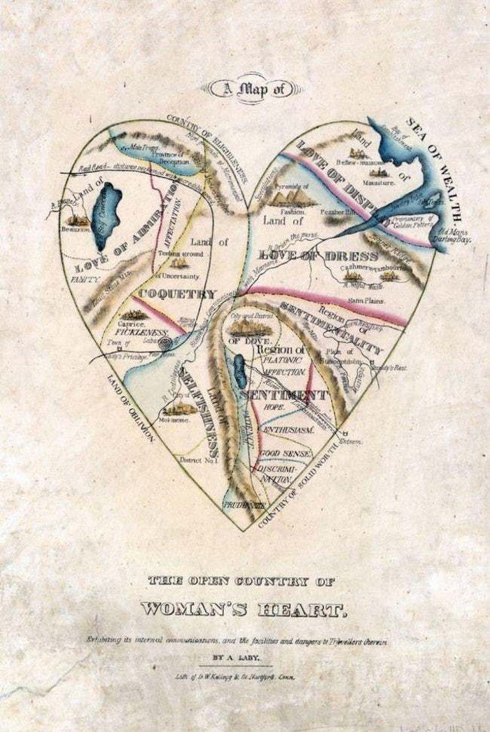 На снимке ниже ты можешь увидеть шуточную карту сердца женщины, созданную в XIX веке. Оформлена она в точном соответствии с канонами средневековой картографии. Из самых примечательных «географических объектов», находящихся в сердце женщины по мнению автора, нужно упомянуть город Любви, пирамиду Моды и земли Забвения.