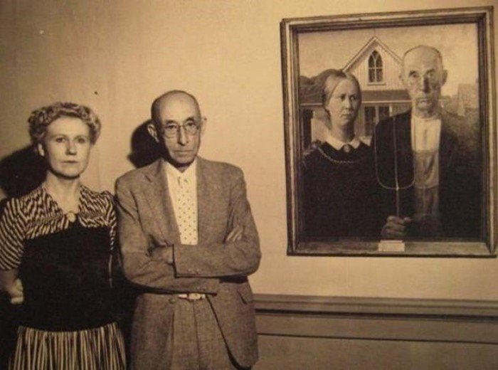 «Американская готика», написанная Грантом Вудом в 1930 году, до сих пор остается одним из самых узнаваемых образов американского искусства. Критики многократно отмечали, как хорошо Вуду удалось передать непривлекательность и даже враждебность своих персонажей — угрюмых отца и дочери, будто бы сфотографированных кем-то на лужайке перед домом. А вот как выглядели модели художника…