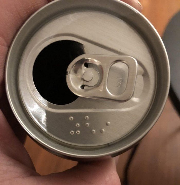 А это заботливая надпись для незрячих: шрифтом Брайля предупреждают о содержании в напитке алкоголя