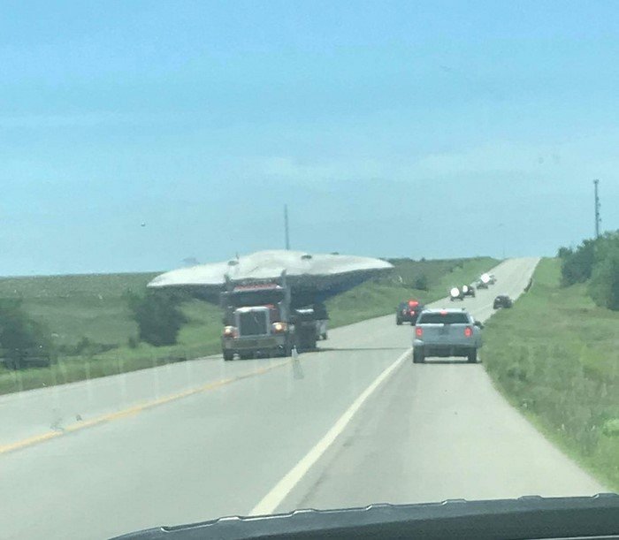 Это не огромный скат и не летающая тарелка плененных инопланетян. На фото запечатлена транспортировка самолета-истребителя