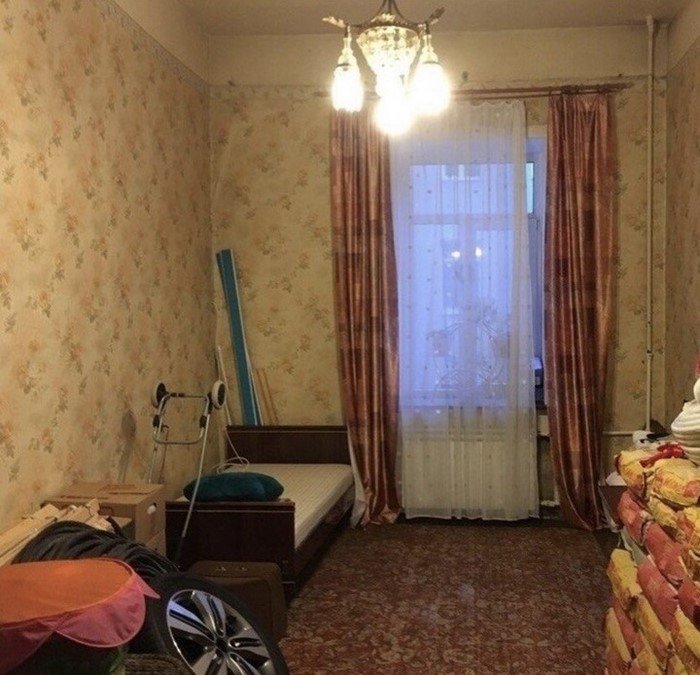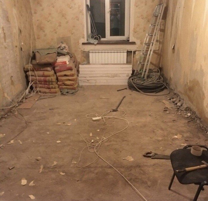 Просчитав все «за» и «против» наперед, молодые муж с женой приняли решение сначала разобраться со всем старьем. Супруги быстро избавились от обветшалых вещей, зачистили стены, сняли с пола покрытие.