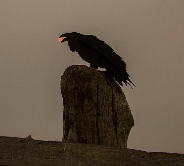 Ворон с заходящим солнцем в клюве будто сошел с обложки альбома какой-нибудь особо мрачной музыкальной группы
