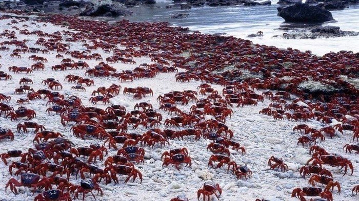 А вот так ведут себя красные крабы на острове Рождества. Каждый год они в огромных количествах мигрируют на побережье, чтобы дать жизнь новому поколению маленьких крабиков.