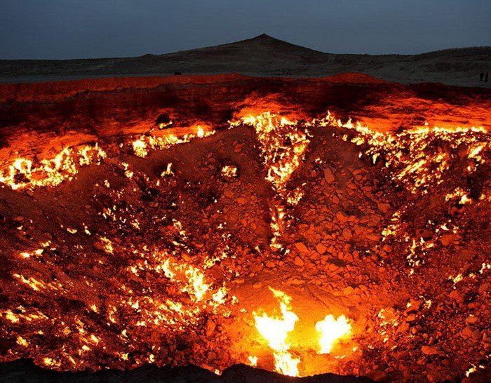 Перед тобой газовый кратер Дарваза, именуемый также «Врата ада». Находится он в Туркменистане. Газ горит здесь беспрерывно с 1971 года.