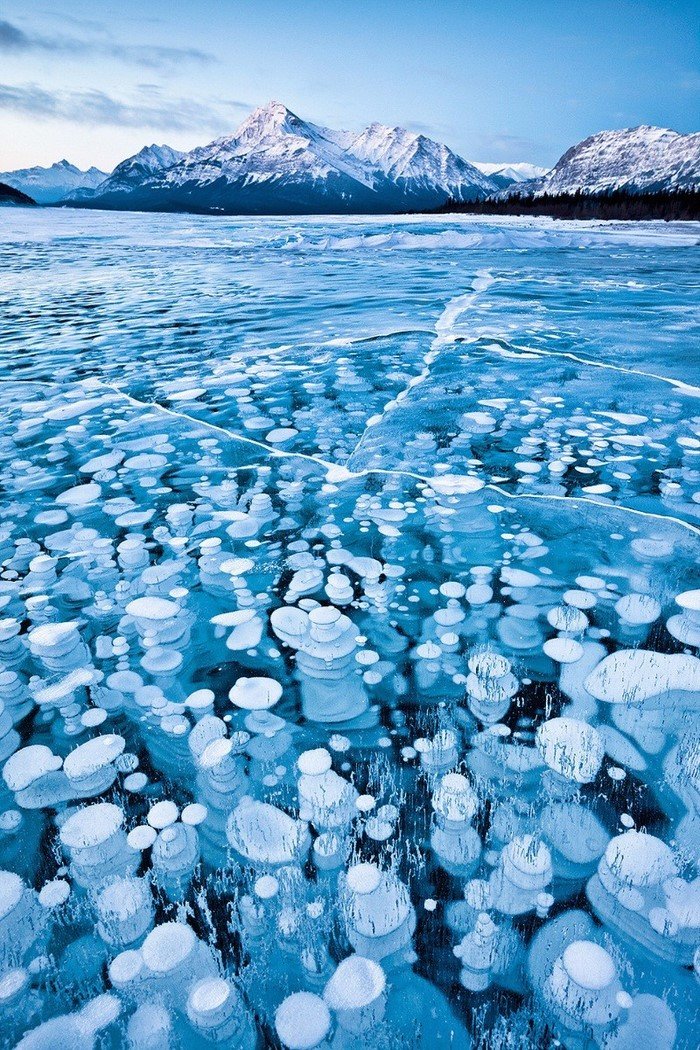 Канадское искусственное озеро Абрахам очень популярно у туристов благодаря узорам, появляющимся на его льду каждую зиму. Всё дело в пузырьках застывшего метана, поднимающихся со дна.