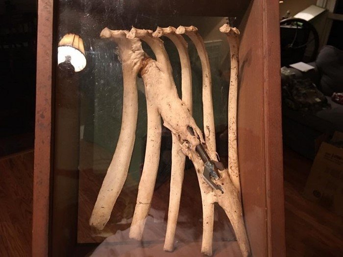 Кость со снимка ниже принадлежит раненному охотником оленю. Стрела вошла в грудную клетку животного, но оно сумело убежать от человека. Страшная рана со временем зарубцевалась, а использованный охотником снаряд врос в кость!