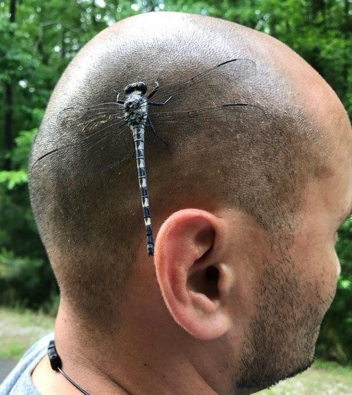 Не знаю, чему тут можно больше поражаться — размерам стрекозы или невозмутимости мужчины? С таким чудовищем на голове трудно оставаться спокойным!