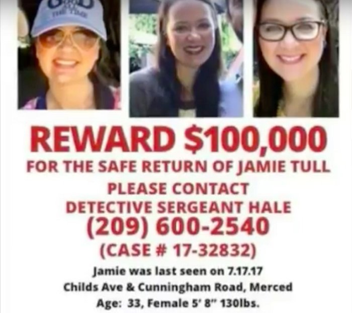 Авто нашли впечатанным в забор фермера в 50 милях от дома Тулл, за рулем ее уже не было. Местная полиция организовала поисковые работы и сообщила о награде в 100 тысяч долларов за информацию о местонахождении пропавшей. Возле машины копы нашли документы Джейми и некоторые из ее личных вещей.