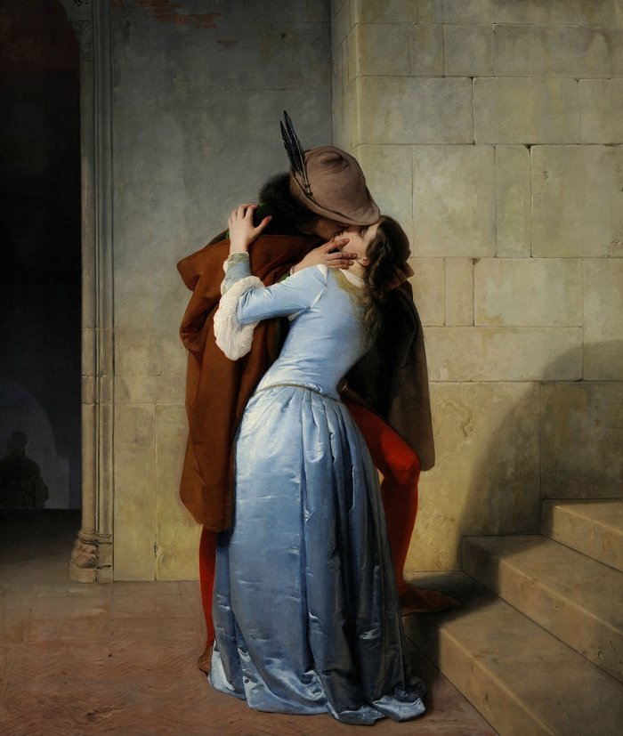Это не просто страстный поцелуй двух влюбленных. У картины есть политический подтекст. В год создания полотна Пьемонт и Сардиния подписали союз с Францией с целью борьбы с Австрией. Синий, красный, белый и зеленый цвета одежды главных героев намекают на цвета итальянского и французского флагов.