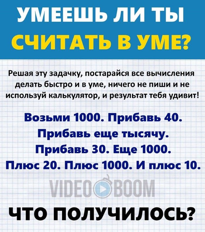 1. 1000 + 40 + 1000 + 30 + 1000 + 20 + 1000 + 10 = 4 100. Почему-то многие люди вместо двузначных чисел прибавляют трехзначные и получают целых 5 000. Невнимательность может сыграть злую шутку.