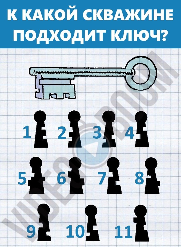 10. Просто визуально поверни ключ, чтобы его передняя часть совпадала с отверстием. Варианты 7 и 9 весьма похожи, но всё-таки правильный — 9.