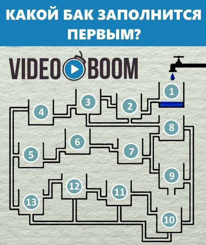 13. Казалось бы, первым должен наполниться резервуар, который находится в самом низу, то есть номер 10. Но если присмотреться, то в него вода попадет гораздо позже 13-го, потому что те пути, которые позволяют набрать 10-й раньше, перекрыты. Значит, правильный ответ — 13!